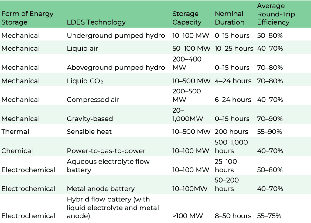 Below, we list the storage capacity, storage duration, and average round-trip efficiency (RTE) of LDES technologies that have commercial or pre-commercial readiness on a global scale.