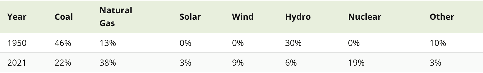 The U.S. generated 1,200% more electricity in 2021 compared to 1950.