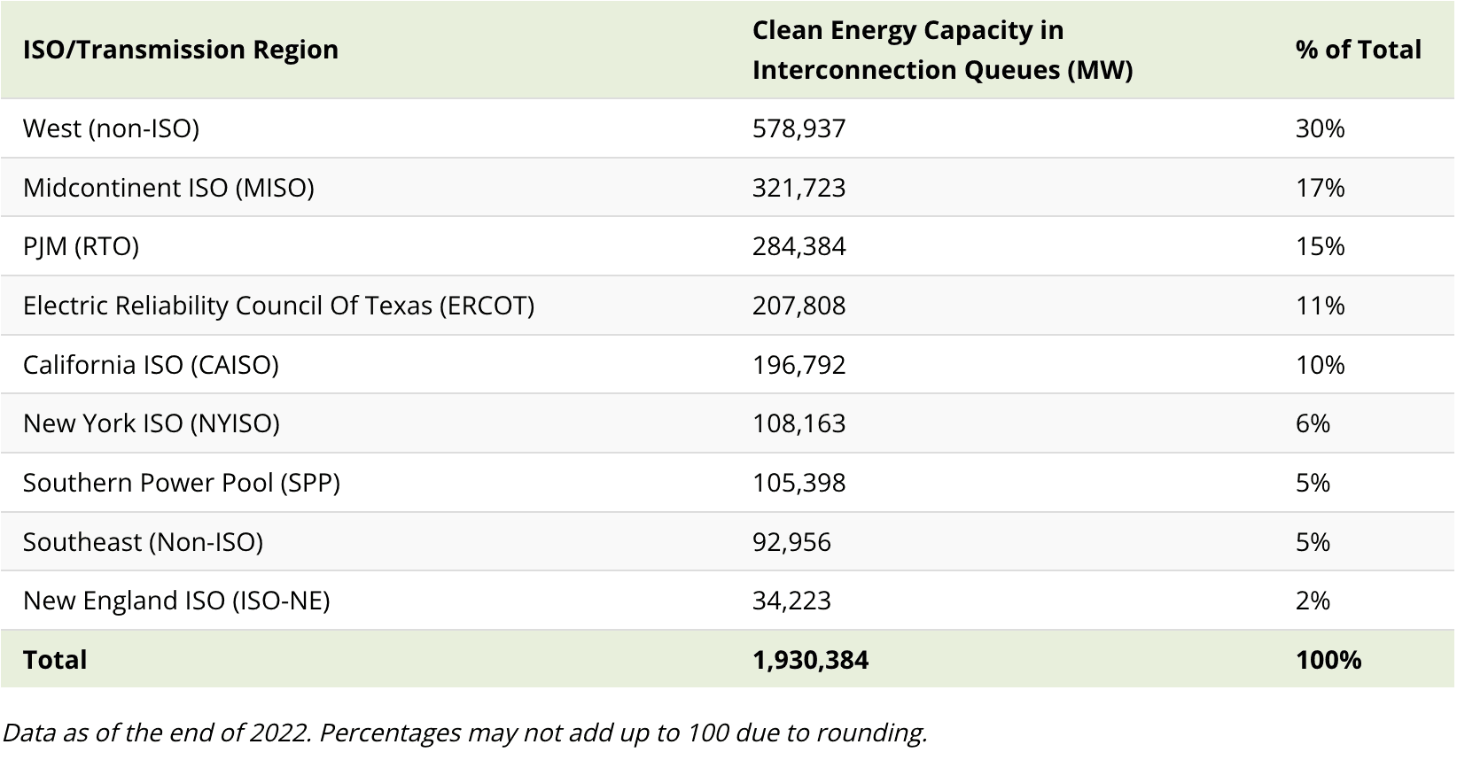 Interconnection queues are managed by Independent System Operators (ISOs) and Regional Transmission Organizations (RTOs) that operate the grid and wholesale electricity markets in different regions. Here’s a look at the clean energy capacity in queues grouped by major transmission regions and ISOs: