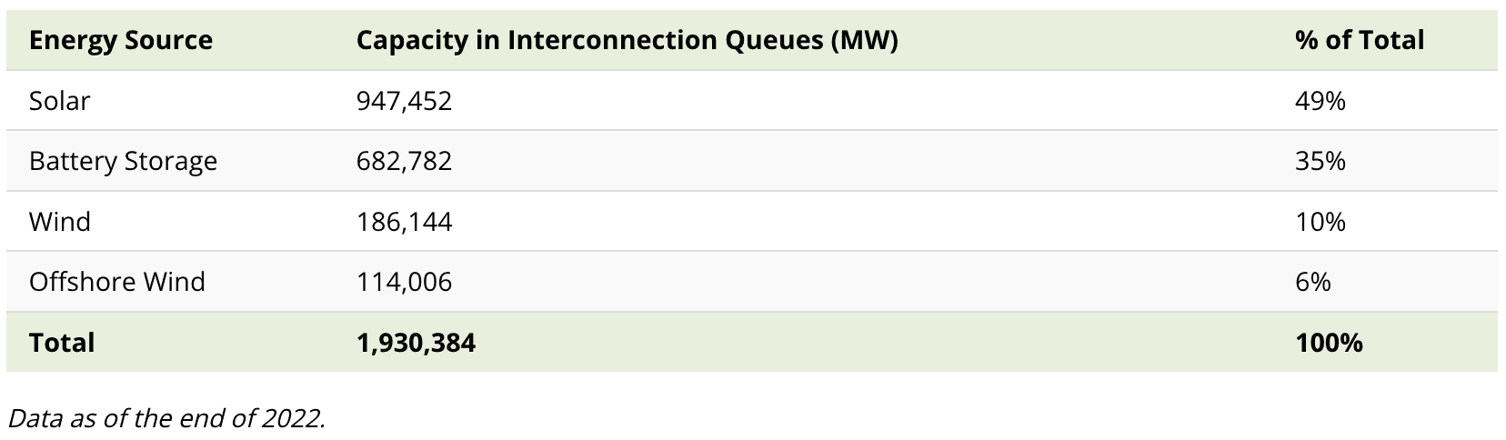 The U.S. has almost 2 million megawatts (MW) of solar, wind, and storage capacity on hold in interconnection queues, seeking connection to the electrical grid.
