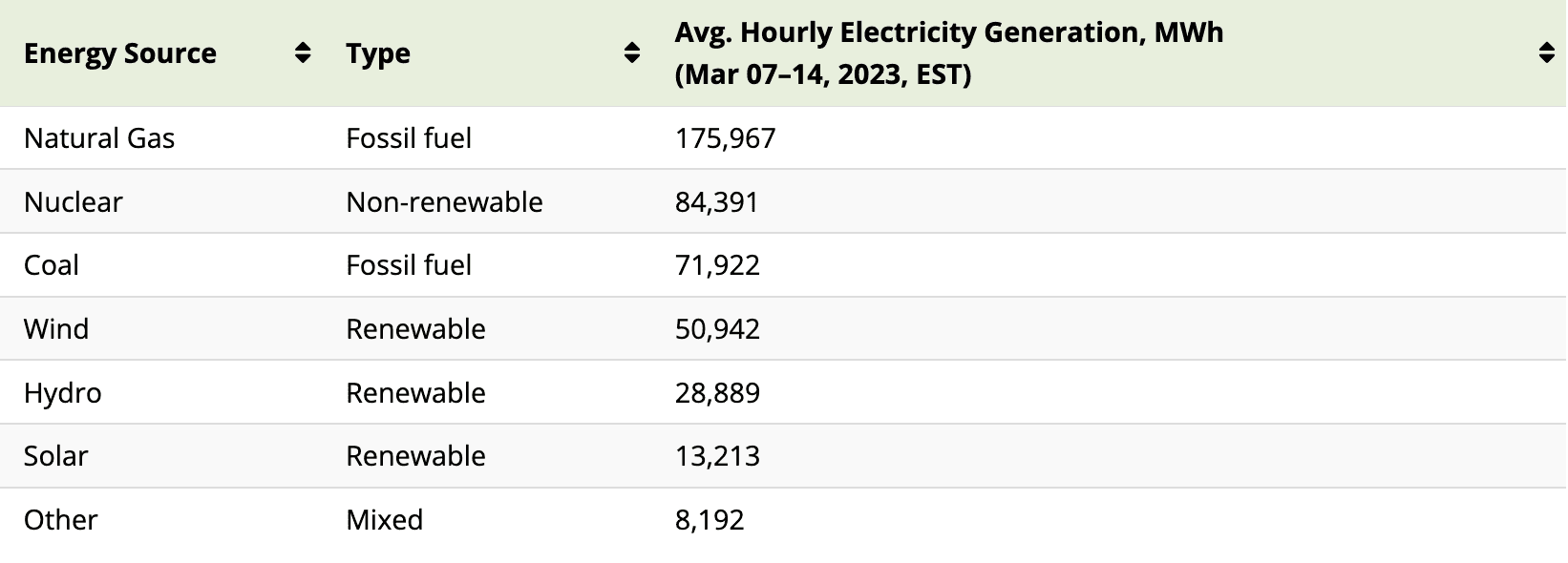 With that context, the table below provides an overview of the average hourly U.S. electricity generation by source for the week of March 7–March 14, 2023, in the Eastern Time Zone.