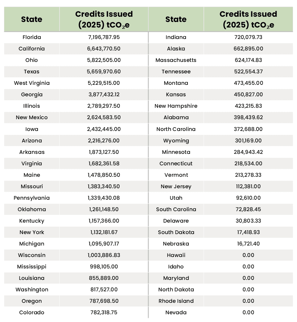 Here is a table showing carbon offset credits issued by state in 2025.