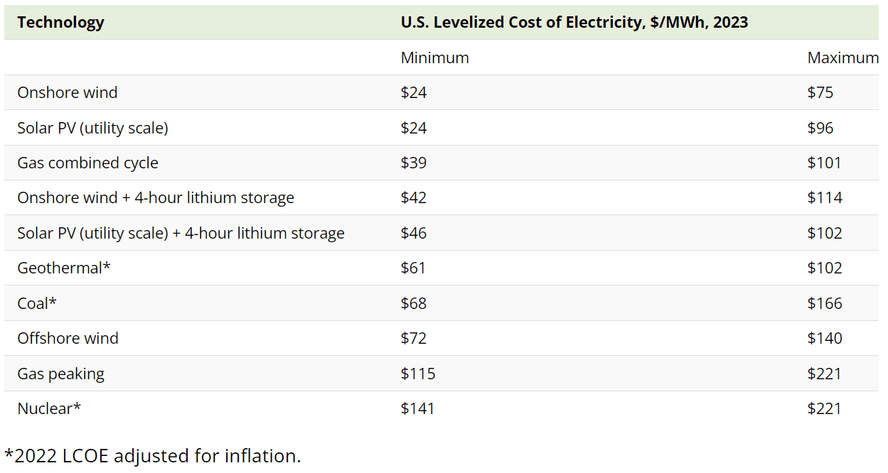 According to Lazard’s 2023 analysis of unsubsidized LCOE in the U.S., both onshore wind and utility-scale solar photovoltaic (PV) technologies are more cost-effective than combined cycle natural gas power plants.