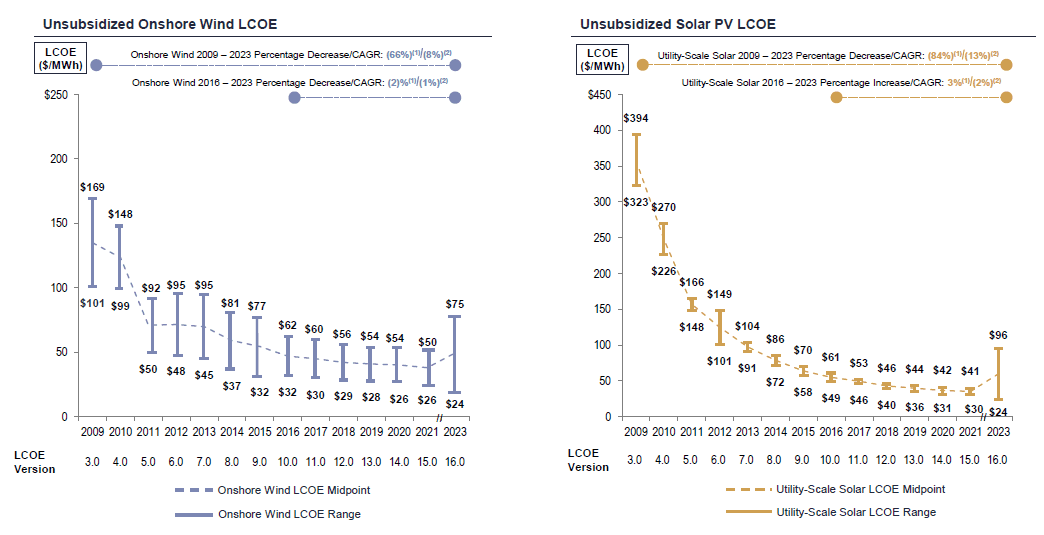 As seen below, the combination of these factors has dramatically pulled down the LCOE of onshore wind and solar PV since 2009, with the exception of 2022-2023.