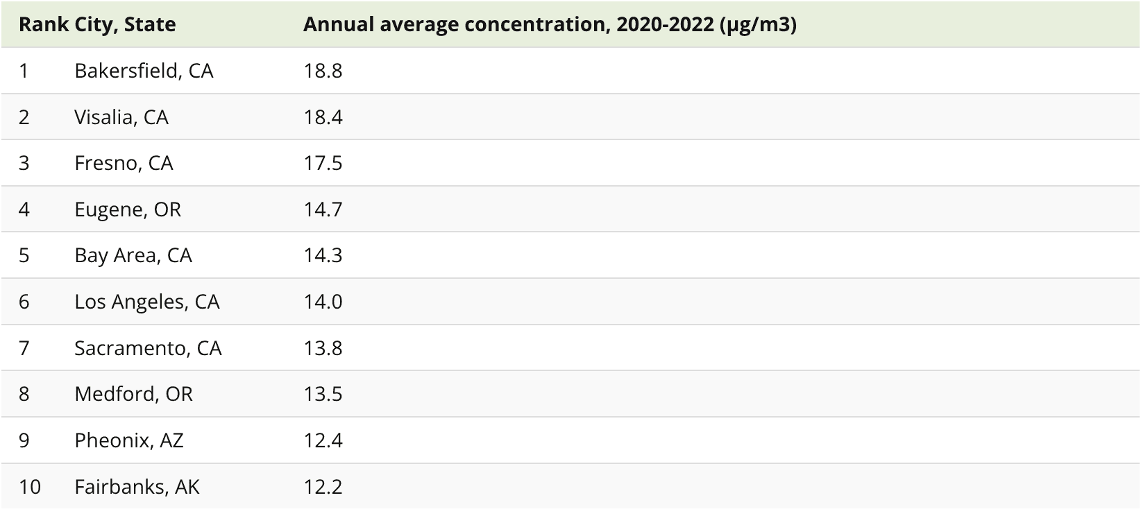 Here are the top 21 most polluted cities in the U.S., according to their annual average PM2.5 concentrations: