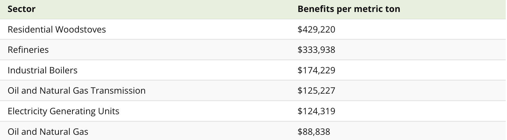Low air quality negatively affects worker productivity, increases absenteeism, and adds both direct and indirect healthcare costs. But the flip side of that equation is that improving air quality has measurable impacts on the wider economy. The EPA published a study that calculated the economic benefits of each metric ton of particulate matter that didn’t end up in the atmosphere, broken down by sector, including utilities.