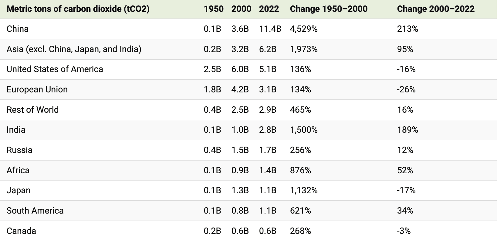 Similarly, India, Japan, and the broader Asian region all experienced emission growth exceeding 1,000% between 1950 and 2000.
