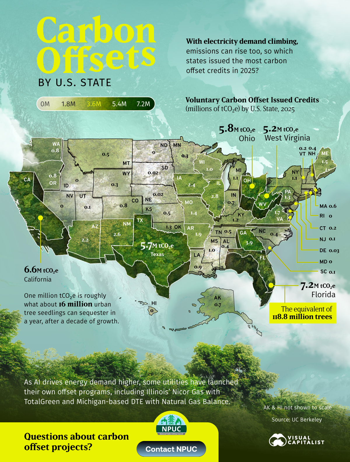 This graphic, in partnership with National Public Utilities Council, maps carbon offsets issued across U.S. states in 2025 using data from UC Berkeley’s Voluntary Registry Offsets Database.