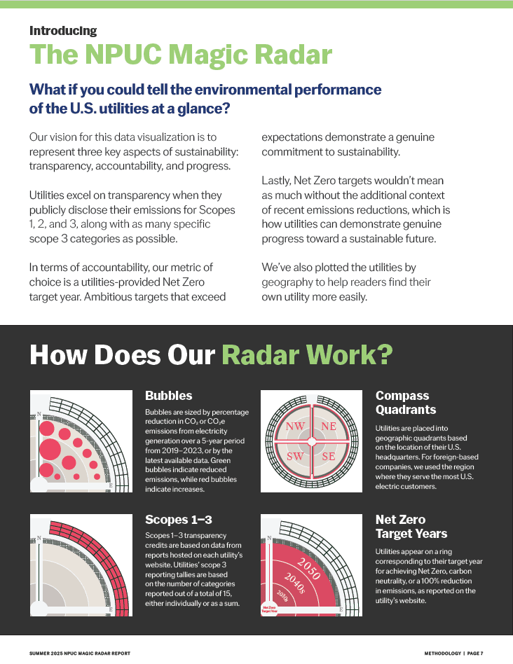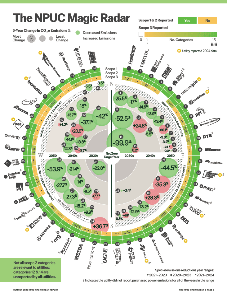 The Magic Radar maps 46 U.S. investor-owned utilities across emissions reporting, reduction progress, and net zero commitments in a single visual framework. Bubble size reflects percentage reduction in CO2 emissions over five years. Position reflects Scope transparency and net zero timeline. It is designed to make the data immediate and actionable without requiring a deep read to understand where each utility stands.
